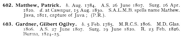 British India Office for Medical Staff, and eventually died as a surgeon in India. Nevertheless, the passenger list can be read in two ways. Either P. Matthew and G. O. Gardner were both assistant surgeons and the newspaper forgot the plural "s," or only G. O. Gardner was an assistant surgeon.