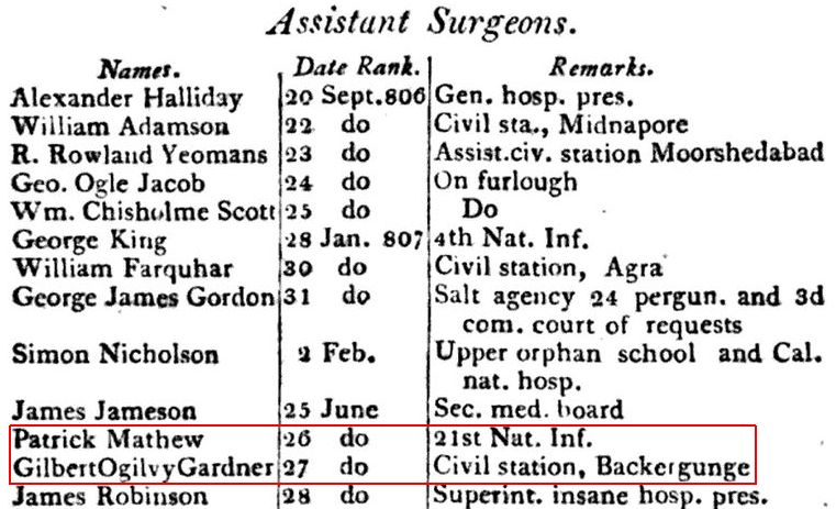 The Asiatic Journal and Monthly Register for British India and its Dependencies (July to Dec. 1822, vol. 14). Under the heading "Military Appointments, Promotions, &c." (beginning at page 183) it says at page 185: "Surg. Gilbert Ogilvie (sic) Gardner to rank from 19th June 1820, vice G. Campbell, retired."