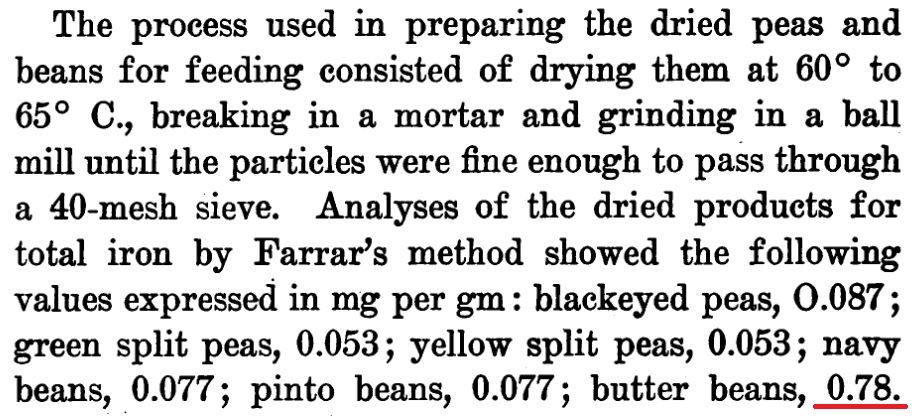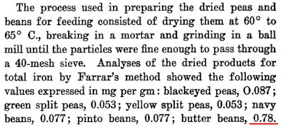 Anybody with a sharp eye will spot the decimal-point error in the value given for butter beans at the end. And that is what the staff of the Nutrient Section of the Bureau of Home Economics did, when they published abstracts in the Journal of Home Economics 32, no. 7, p. 481: