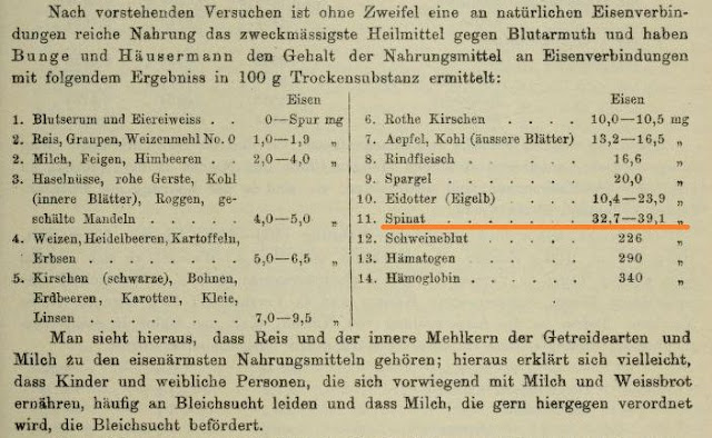 In parallel to this tenacious folklore, there's a narrative about research being error prone but also self-correcting. For example, Bunge (1892) did not correct the iron contents of ash analyses for oxygen gained during combustion (see here), but he nevertheless concluded that spinach (and strawberries for that matter) do not have the high values given by Wolff (1871). That is, he drew a basically correct conclusion despite erroneous data treatment. Again, Haensel's (1909) iron contents were an order of magnitude too high for all the vegetables he analysed, but the relation between the data showed that spinach was not exceptional in comparison with the other vegetables. Consequently, Haensel drew a correct conclusion based on poor data (see here). And so on in the 1930s etc.